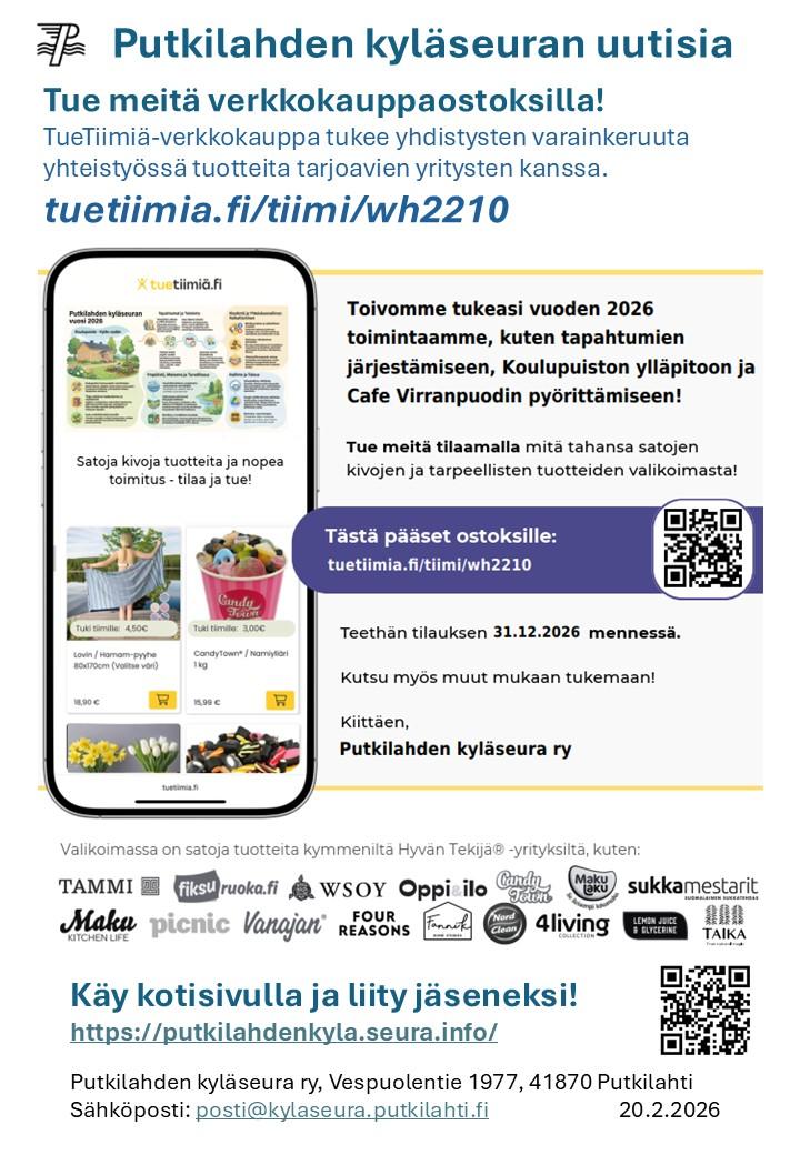 Putkilahden kyläseuralla oli vuoden 2025 lopussa jo 125 jäsentä, ja jäsenmäärä on kasvanut selvästi viime vuosina. Tutustu toimintaamme, ota yhteyttä ja tule mukaan! Yhteystiedot, vuoden 2026…
