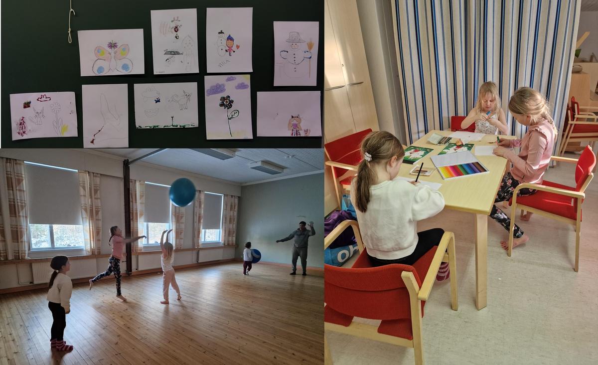 Lapset tykkäsivät reippailusta jumppasalissa, muista leikeistä sekä piirtämisestä, josta syntyi kiva taidenäyttely luokkataululle. Sekä isot että pienet nauttivat kahvi-, tee- ja mehuhetkistä pullien ja vohvelien kera sekä Teijan kokkaamista (perinteisestä ja kasvis-) hernekeitoista.